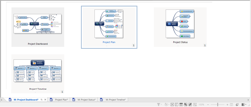 This view displays preview images of the current map and all the maps that it links to. You can choose to display only the first level maps — those directly linked to this map — or maps at the second, third, or all levels. The map's level in relation to the parent is displayed as a small number in the lower-right of the map thumbnail.