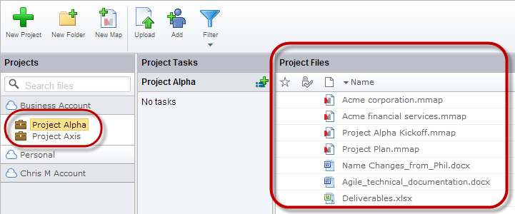 A project is the collection of assets that includes people, a list of tasks, and content (maps and files). Each time you start a new project, a wizard guides you through the steps to name your project, invite people to join it, create a main project map, and add project content (other maps and files).