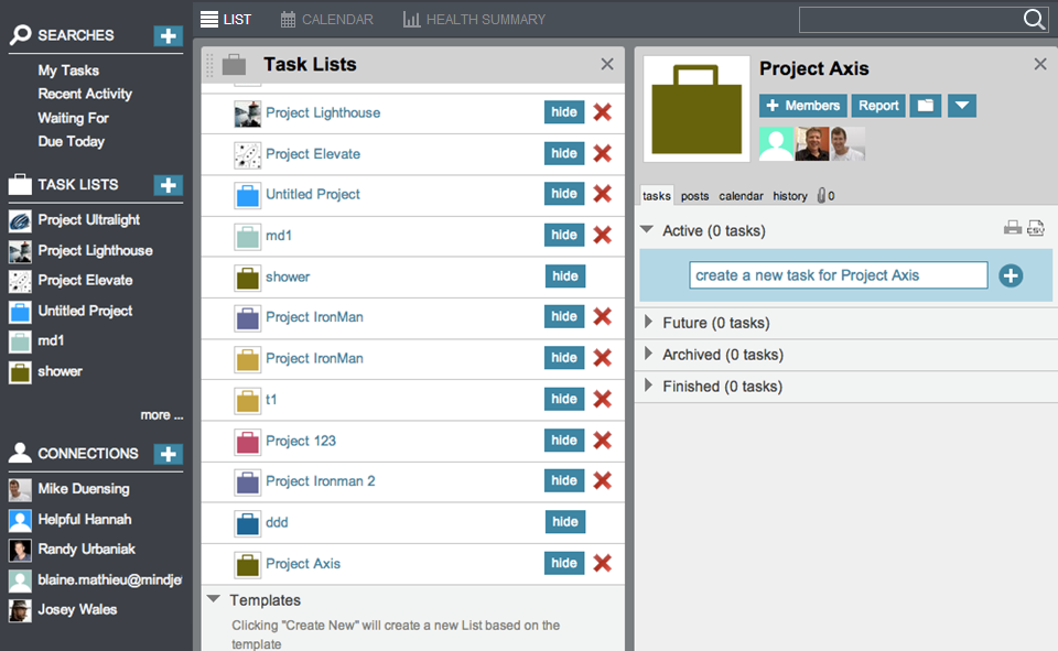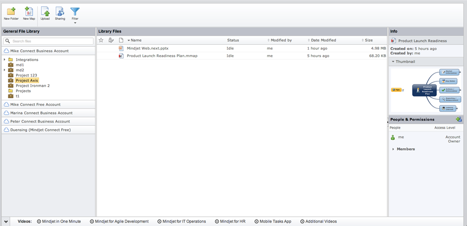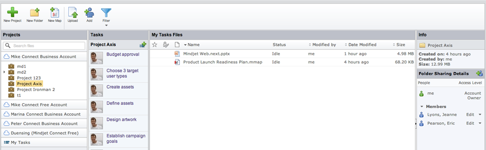 Projects view shows all your projects and the Tasks, Maps and Files, and people associated with each project. Projects can have folders for online content management and file storage. You can create and manage projects, tasks, maps and files from this view. You can also add and remove people from projects, and set their permissions for projects and their content.