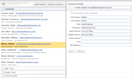 ProjectDirector lets you create your own personal Contacts list by adding new colleagues manually or importing information from your Microsoft® Outlook®, Gmail™, Hotmail®, or Yahoo!® Mail address books. Contacts view also allows you to find and view contact information for account users in any account that you belong to.