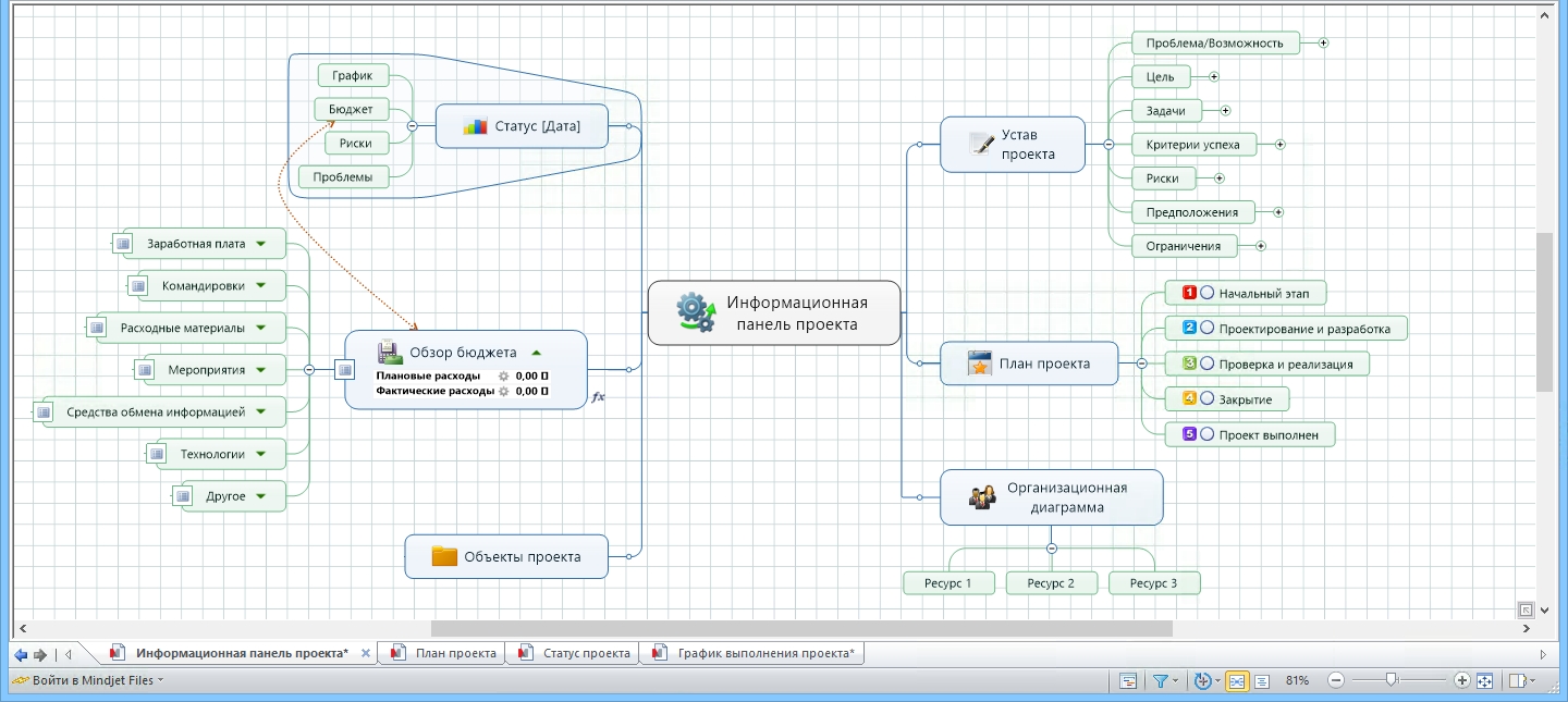 Программа MindManager запускается в режиме карты. Это оптимальный режим для создания и редактирования ваших карт, дающий полное представление о том, что они собой представляют. В этом режиме отображаются все компоненты карты, включая плавающие темы, связи, изображения и границы. Скорее всего большая часть работы с программой будет осуществляться в этом режиме. Для небольших карт навигация предельно проста и осуществляется с помощью мыши. Для больших карт может оказаться полезным использование возможностей свертывания и развертывания тем, упрощая перемещения по карте.