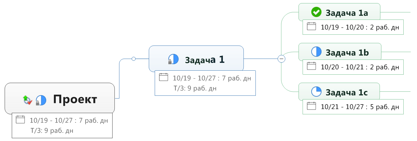 Задания на вашей карте могут происходить из множество источников: их можно ВВОДИТЬ вручную, создавать с помощью ссылок на задания в Outlook, SharePoint или на сервере Mindjet Tasks, а также импортироваться из проекта. Для заданий определены сведения на панели Информация о задании, например, дата начала и дата выполнения. Рабочие дни, доступные для выполнения заданий, определяются в календаре информации о задании. Примечание. У вас может не быть доступа к онлайн-функциям MindManager. Но если у вас есть учетная запись MindManager Plus, Mindjet for Business или ProjectDirector, вы можете включить онлайн-функции MindManager в меню Параметры. Параметры управления заданиями используются с учетом настроек на панели "Информация о задании" для карты, что позволяет автоматически вычислять и обновлять информацию о задании на карте. Для автоматического пересчета информации о задании для нескольких тем их общую родительскую тему можно пометить как сводную. Рассчитанные сведения о задании показываются в родительской теме со специальными маркерами. Можно отобразить зависимости между заданиями в сводных ветвях, указать тип для каждой зависимости. При обновлении информации о задании для независимого задания, если необходимо, то обновляется информация о зависимом задании, с учетом типа зависимости. Также можно выбрать, нужно ли выделять особым цветом в сводных ветвях задания, выполняемые с риском или просрочкой. Вы также можете комбинировать информацию о расходах, связанные с заданиями. Дополнительную информацию см. в разделе Определение расходов на задания. |