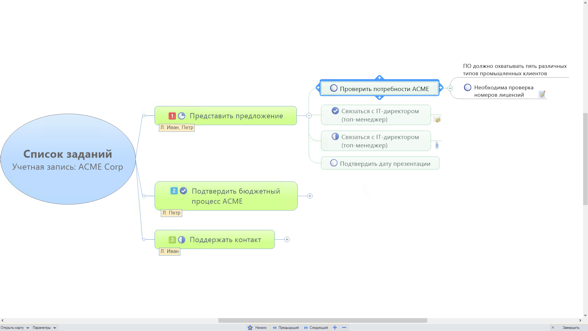 Режим пошагового обзора – это альтернативный режим, который позволяет перемещаться между элементами с минимальными помехами. Он выполняет переключение из обычного режима карты в полноэкранный режим, обеспечивая для карты максимальное пространство, и скрывает все меню и панели инструментов. В нем также имеется возможность автоматически сворачивать темы, что позволяет проводить презентации без каких-либо проблем. Панель инструментов презентации, расположенная в нижней части экрана, позволяет перемещаться по картам и переключаться между ними. В этом режиме также можно использовать сочетания клавиш, чтобы быстро открывать, выбирать, редактировать и даже создавать новые карты. |