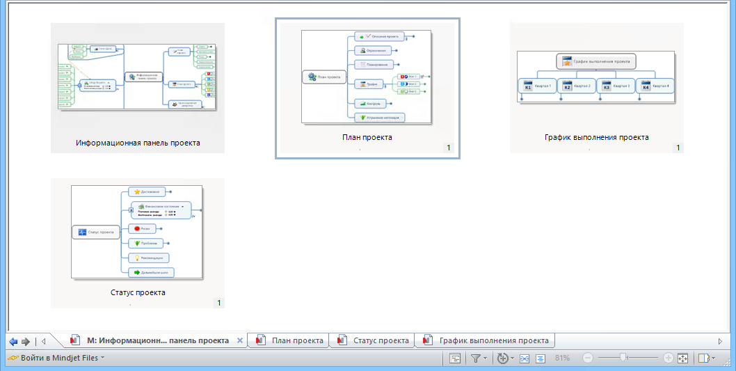 В этом режиме отображаются изображения для предварительного просмотра текущей карты и всех карт, ссылки на которые она содержит. Можно выбрать, следует ли отображать только карты первого уровня, то есть карты, которые напрямую связаны с рассматриваемой, или еще карты второго, третьего или других уровней. Уровень карты относительно родительского элемента отражается в виде маленькой цифры в нижнем правом углу изображения миниатюры карты. Онлайн-функции