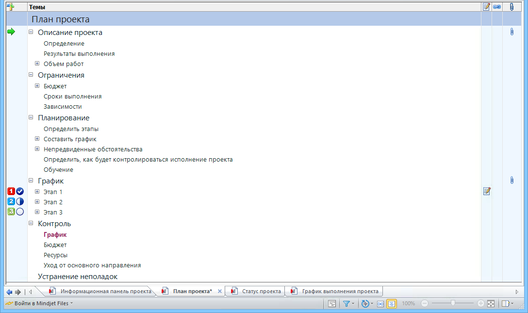 В режиме структуры отображается колонка Темы, в которой содержится текст темы. Чтобы сворачивать или разворачивать темы, используйте значки + и - в этом режиме. Кроме этого, в других колонках содержится следующая информация.
