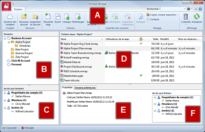 Vous pouvez utiliser et gérer des maps et d'autres fichiers entreposés en ligne dans les Fichiers Mindjet à partir de la fenêtre des Fichiers Mindjet.