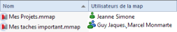 Dans la fenêtre des Fichiers Mindjet, sélectionnez une map, puis double-cliquez dessus ou cliquez sur Ouvrir. Si un utilisateur est en train d'effectuer une modification, il est répertorié dans la colonne Utilisateurs de la map. |