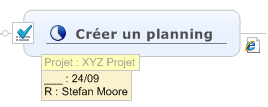 Le sujet de map est dynamiquement lié à la tâche en ligne correspondante. Le lien étant bidirectionnel, toutes les modifications apportées au sujet de tâche figurant sur la map sont synchronisées vers les Tâche Mindjet en ligne. Le sujet de map, quant à lui, affiche en permanence des informations d'actualité. Utilisez le lien de sujet pour ouvrir la tâche en ligne dans Mindjet ProjectDirector. |