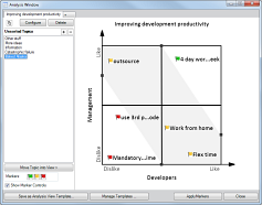 Le mode Analyse vous permet de prendre de meilleures décisions en hiérarchisant et en catégorisant vos sujets de map. Cette fonctionnalité vous permet d'afficher des sujets de votre choix dans un diagramme analytique 2 x 2 personnalisable et de les positionner afin de refléter leurs rangs respectifs en utilisant les valeurs des axes du diagramme comme critères. Des marqueurs sont appliqués aux sujets en fonction de leur position dans le diagramme. Cette méthode qualitative et visuelle (par opposition aux méthodes
